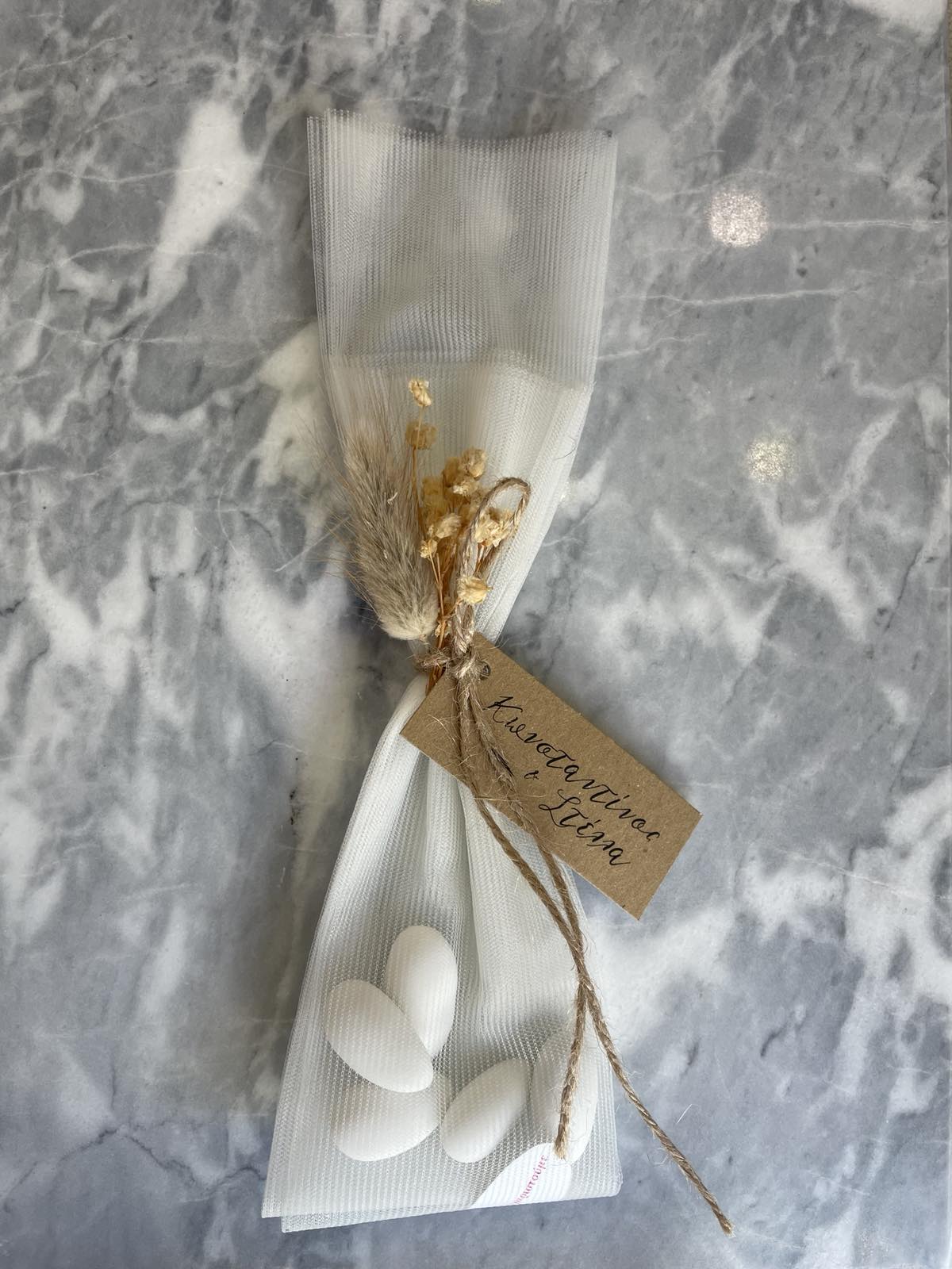 Τούλινες μπομπονιέρες για γάμο με αποξηραμένα και κραφτ καρτάκι με ονόματα