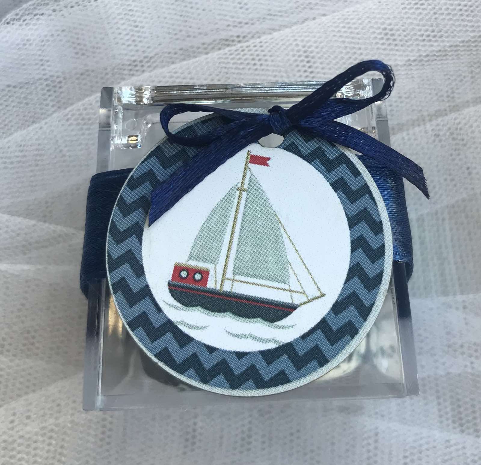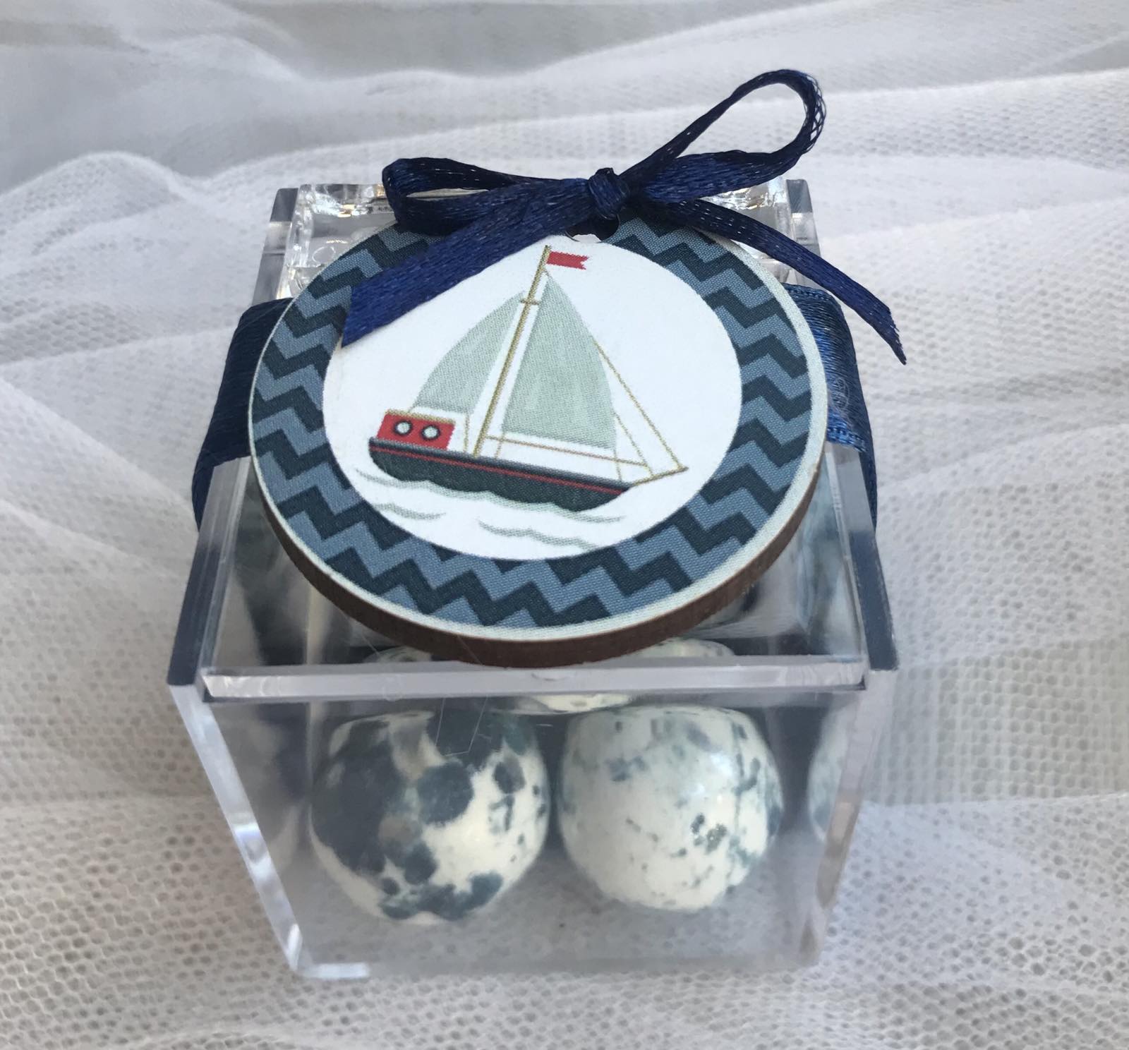 Η μπομπονιέρα περιλαμβάνει: plexiglass κουτάκι διαστάσεις 5,5×5,5×4,5εκ, ξύλινο κοπτικό με καραβάκι Φ4εκ, κορδέλα και 5 κουφέτα πιτσιλωτά Crispy Navy