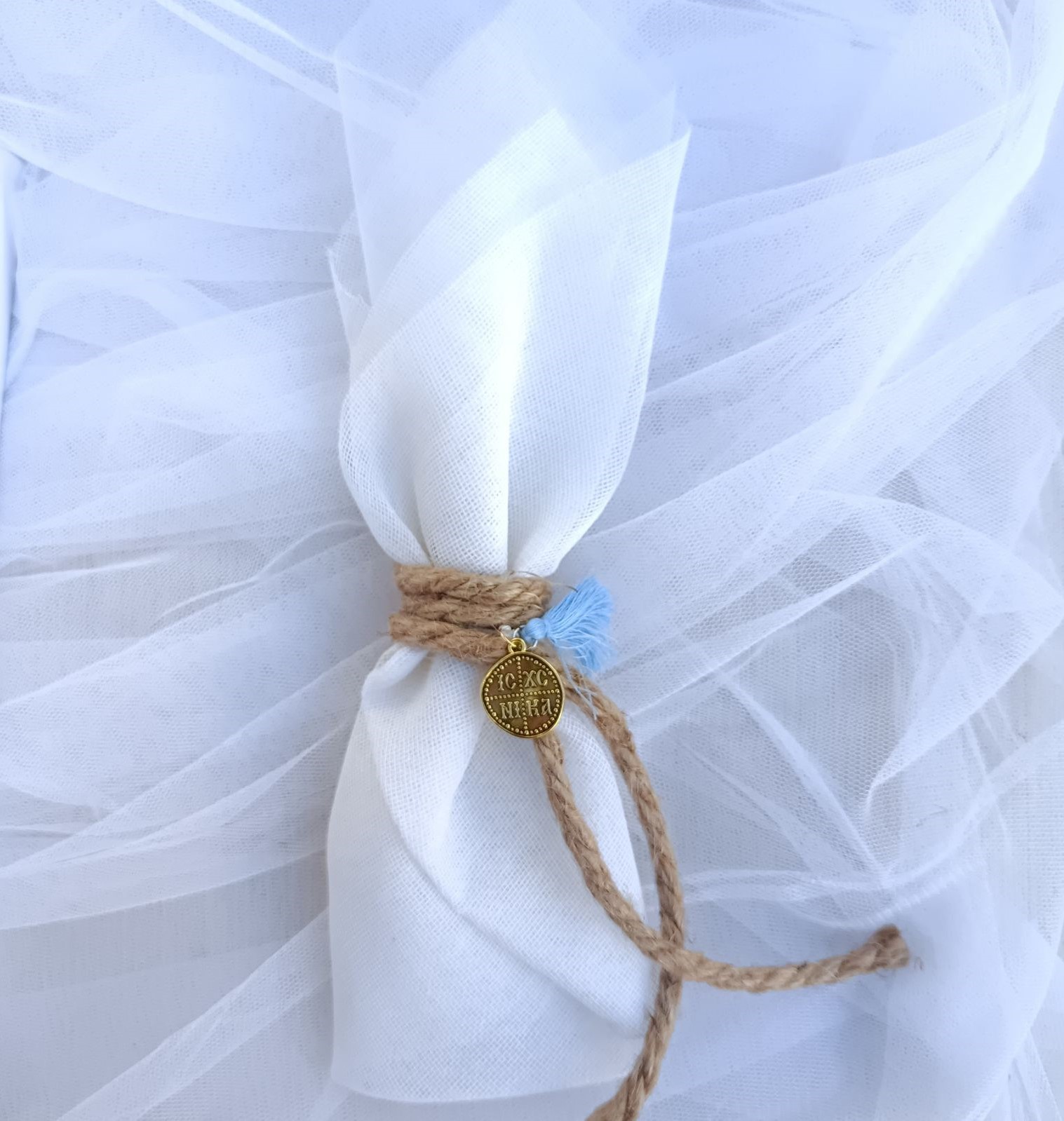 Στην αναγραφόμενη τιμή η μπομπονιέρα περιλαμβάνει: γάζα 37Χ37εκ, τούλι σε περίτεχνο δέσιμο, κορδόνι λινάτσας, κωνσταντινάτο, γαλάζια φουντίτσα και 5 κουφέτα αμυγδάλου SUPREME Χατζηγιαννάκη