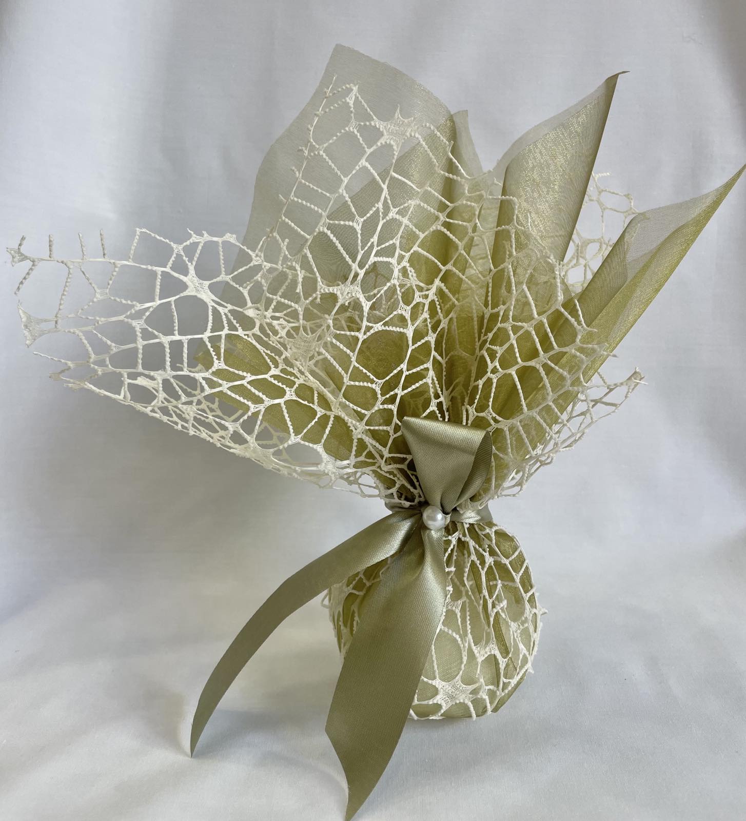 Μπομπονιέρες για γάμο με δίχτυ και οργαντίνα, κορδέλα σε πράσινο ελιάς