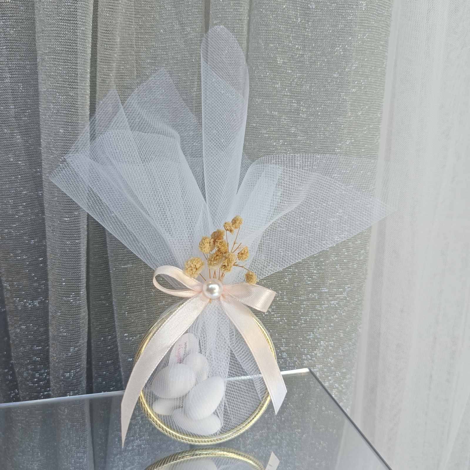 Μπομπονιέρα γάμου με χρυσό μεταλλικό κύκλο 7εκ. κι δέσιμο φιόγκου με αποξηραμένη γυψοφίλη.