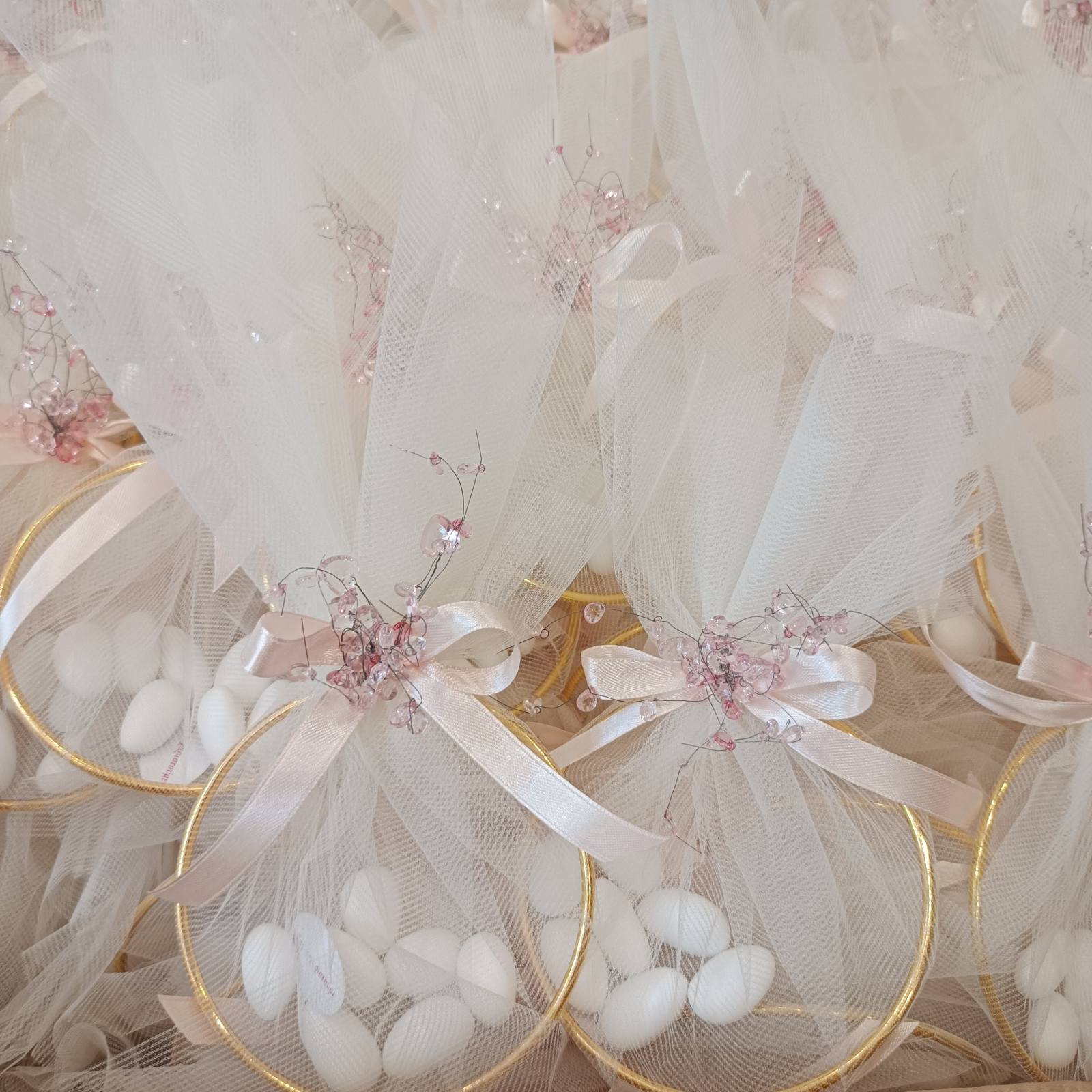 Στην αναγραφόμενη τιμή οι μπομπονιέρες περιλαμβάνουν: κύκλος Φ10εκ, ιδιαίτερο δέσιμο, κρυσταλλάκια και 5 κουφέτα αμυγδάλου SUPREME Χατζηγιαννάκη