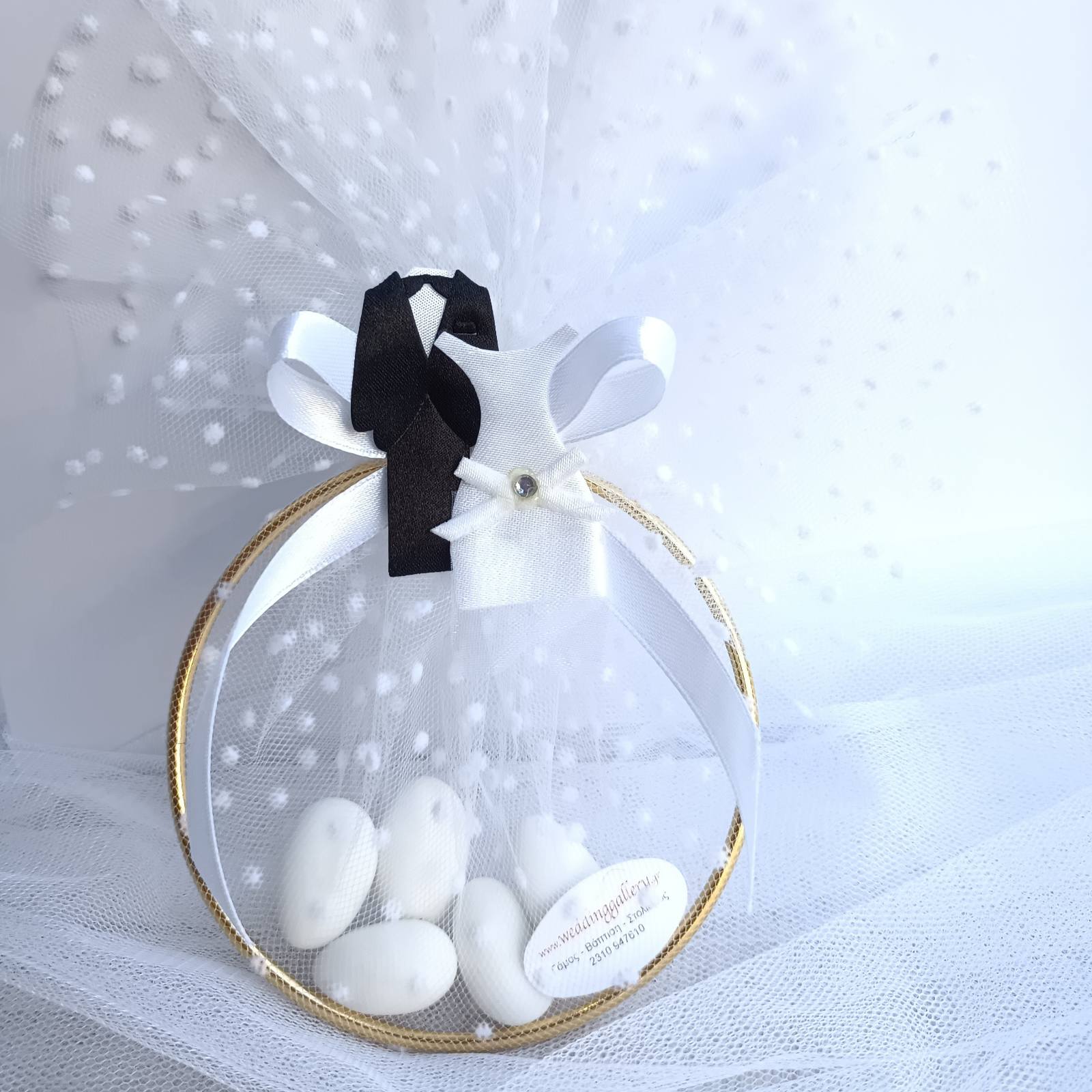 Μπομπονιέρα για το γάμο σας με χρυσό μεταλλικό κύκλο σε εντυπωσιακό δέσιμο και διακόσμηση υφασμάτινες φιγούρες γαμπρός και νύφη