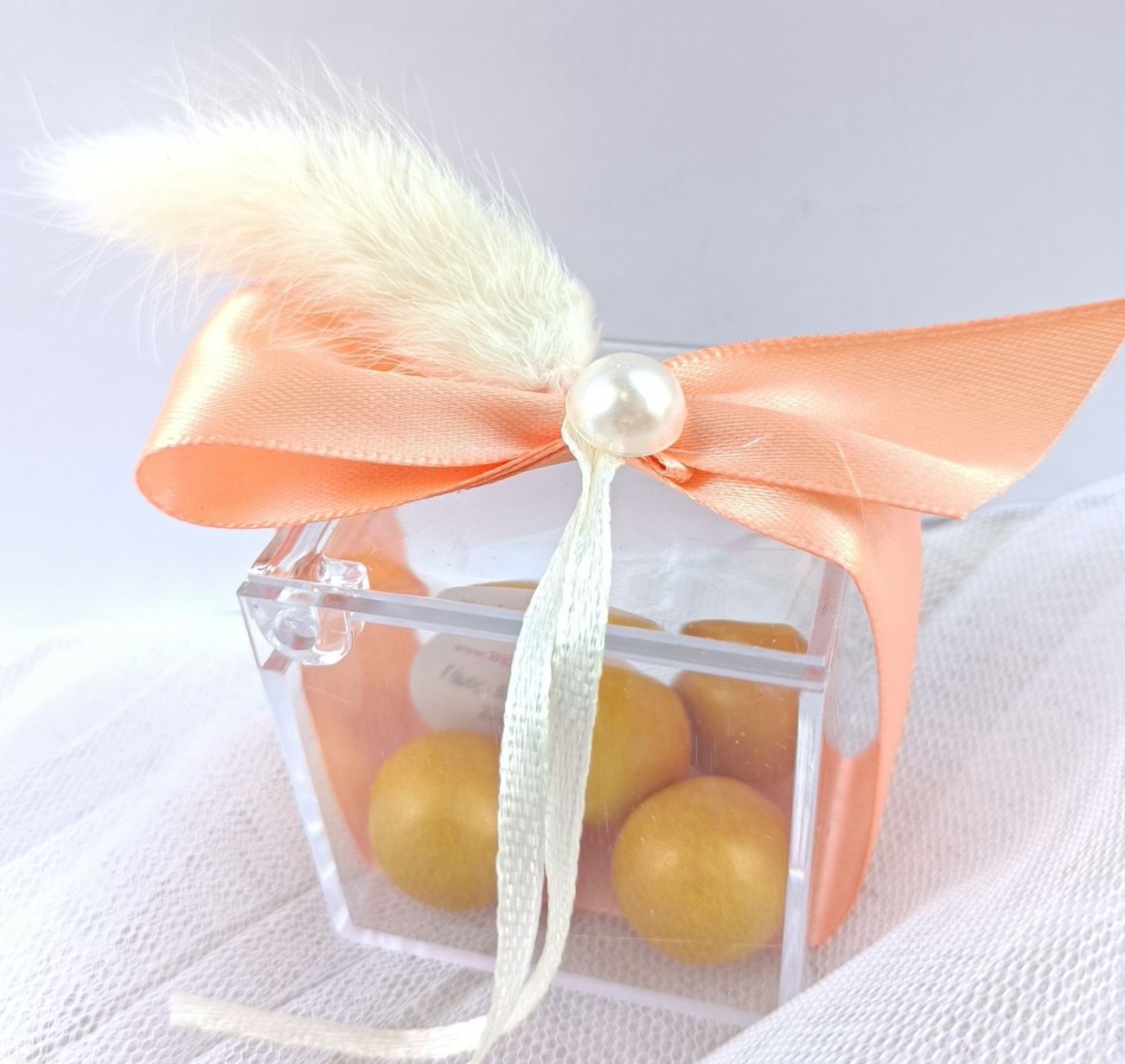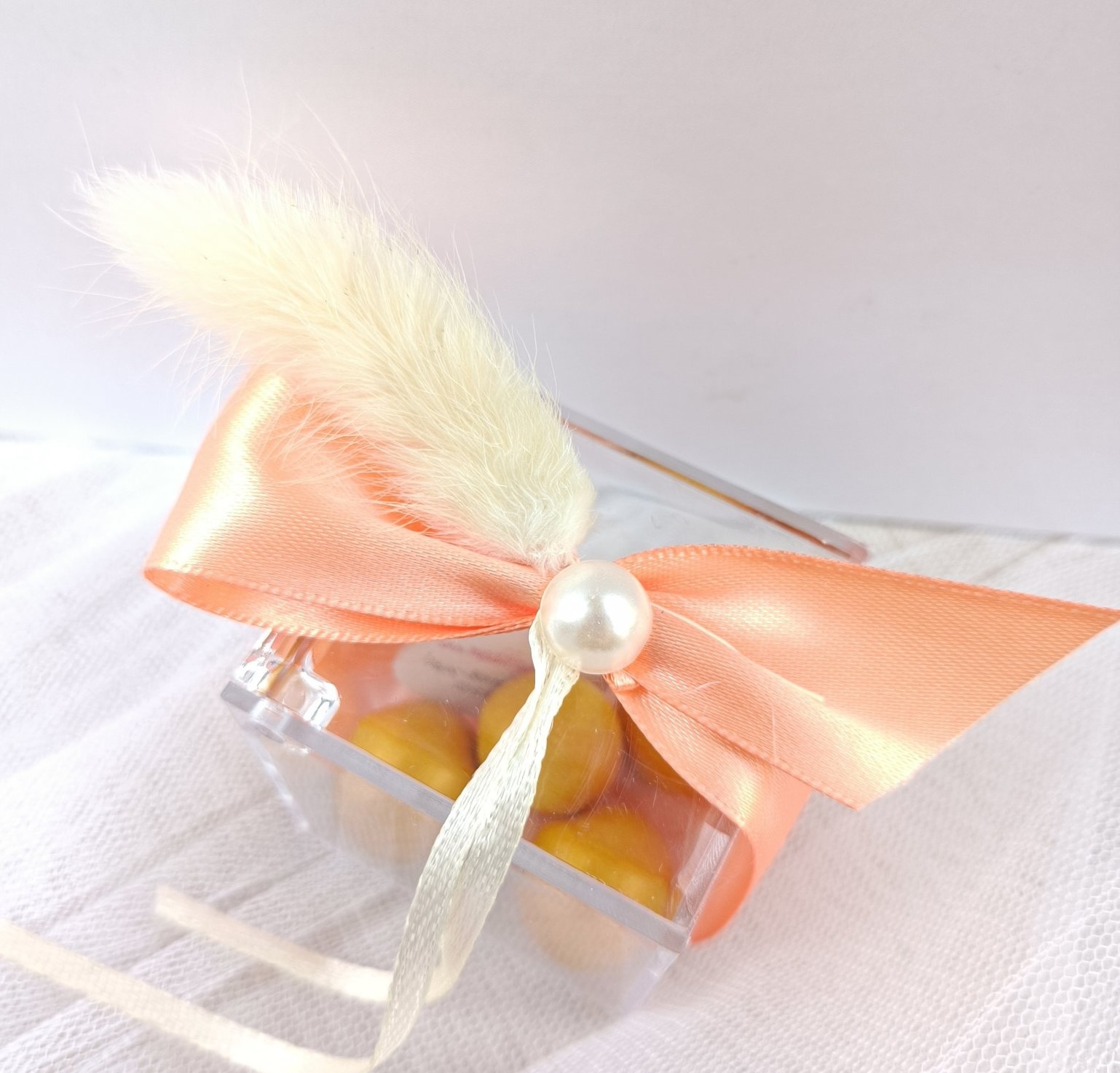 Εντυπωσιακή μπομπονιέρα γάμου κουτί plexi glass με διακόσμηση bunny tail και πέρλα