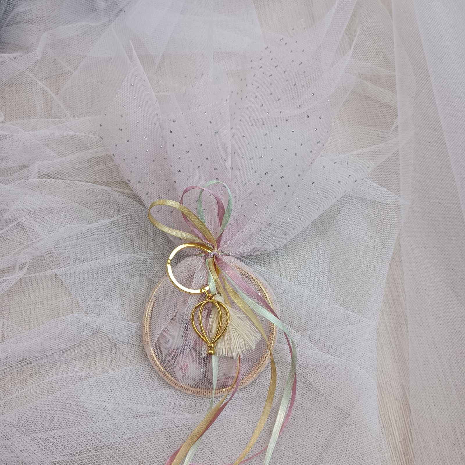 Μπομπονιέρα βάπτισης χρυσός μεταλλικός κύκλος με μπρελόκ αερόστατο. Μια όμορφη μπομπονιέρα – ενθύμιο για την θεματική σας βάπτιση!