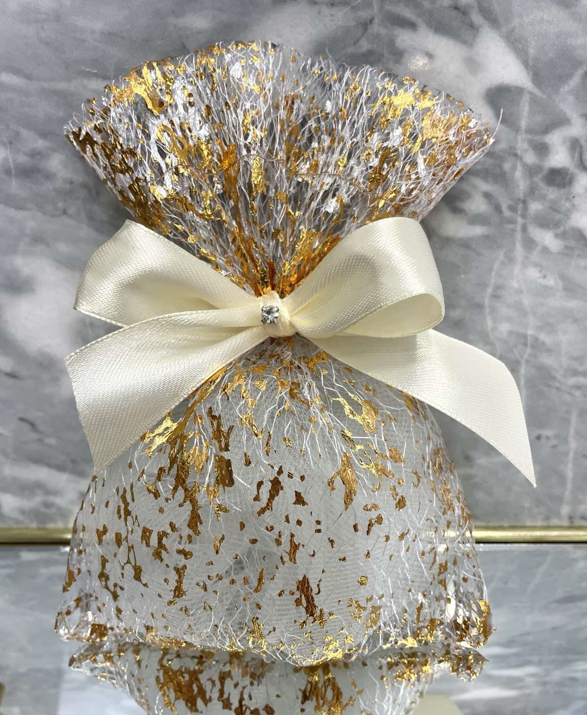 Έτοιμη μπομπονιέρα χρυσό πουγκί με δέσιμο σατέν κορδέλα και strass, μια όμορφη μπομπονιέρα για το γάμο σας!