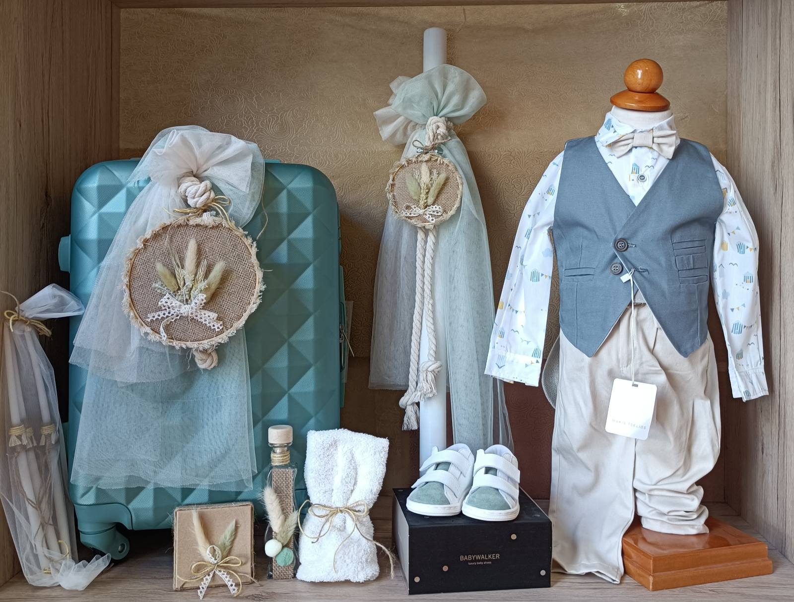 Σετ λαδιού σε κομψό καλαθάκι που περιλαμβάνει: Πετσέτα του παπά, σαπούνι μπουκάλι λαδιού, κεριά κολυμπήθρας στολισμένα στο θέμα μας.