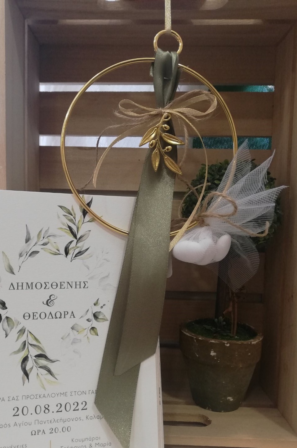 Προσκλητήριο-μπομπονιέρα γάμου μια ιδιαίτερη πρόταση σε χρυσό μεταλλικό κύκλο με διακόσμηση ελιά