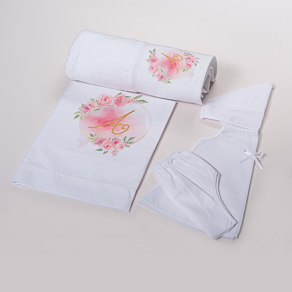 Σετ λαδόπανα για κορίτσια με μονόγραμμα. Όμορφη μπορντούρα με λουλουδάκια στην πετσέτα και το λαδόπανο και βαμβακερά εσώρουχα.