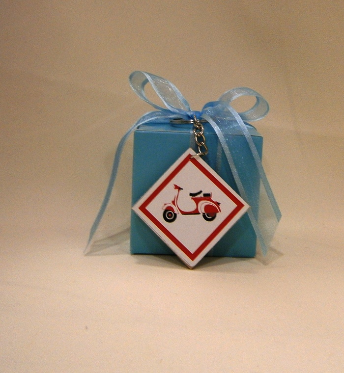 Μπομπονιέρα για βάπτιση σε κουτί γαλάζιο, στολισμένο με και γαλάζια κορδέλα και μπρελόκ με θέμα κόκκινη βέσπα. Μια πολύ οικονομική πρόταση για τη βάπτιση του μικρού σας πρίγκιπα.