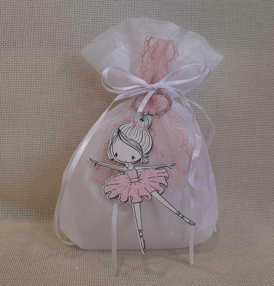 Για τη βάπτιση σας μπομπονιέρα μπαλαρίνα μπρελόκ σε πουγκί οργαντίνα.Εντυπωσιακή μπομπονιέρα βάπτισης μπρελόκ μπαλαρίνα!