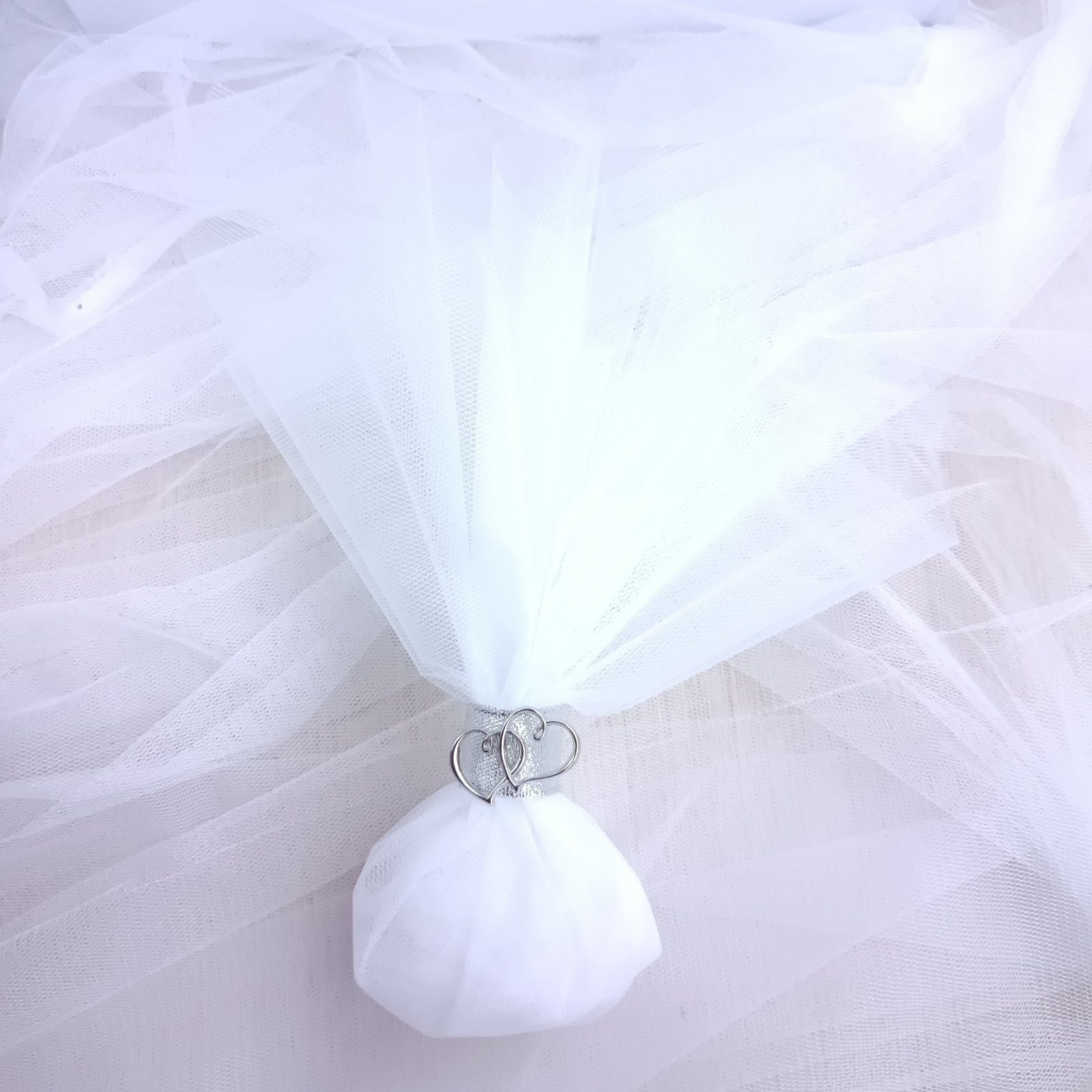 Μπομπονιέρα γάμου τούλινη με ασημί καρδούλες