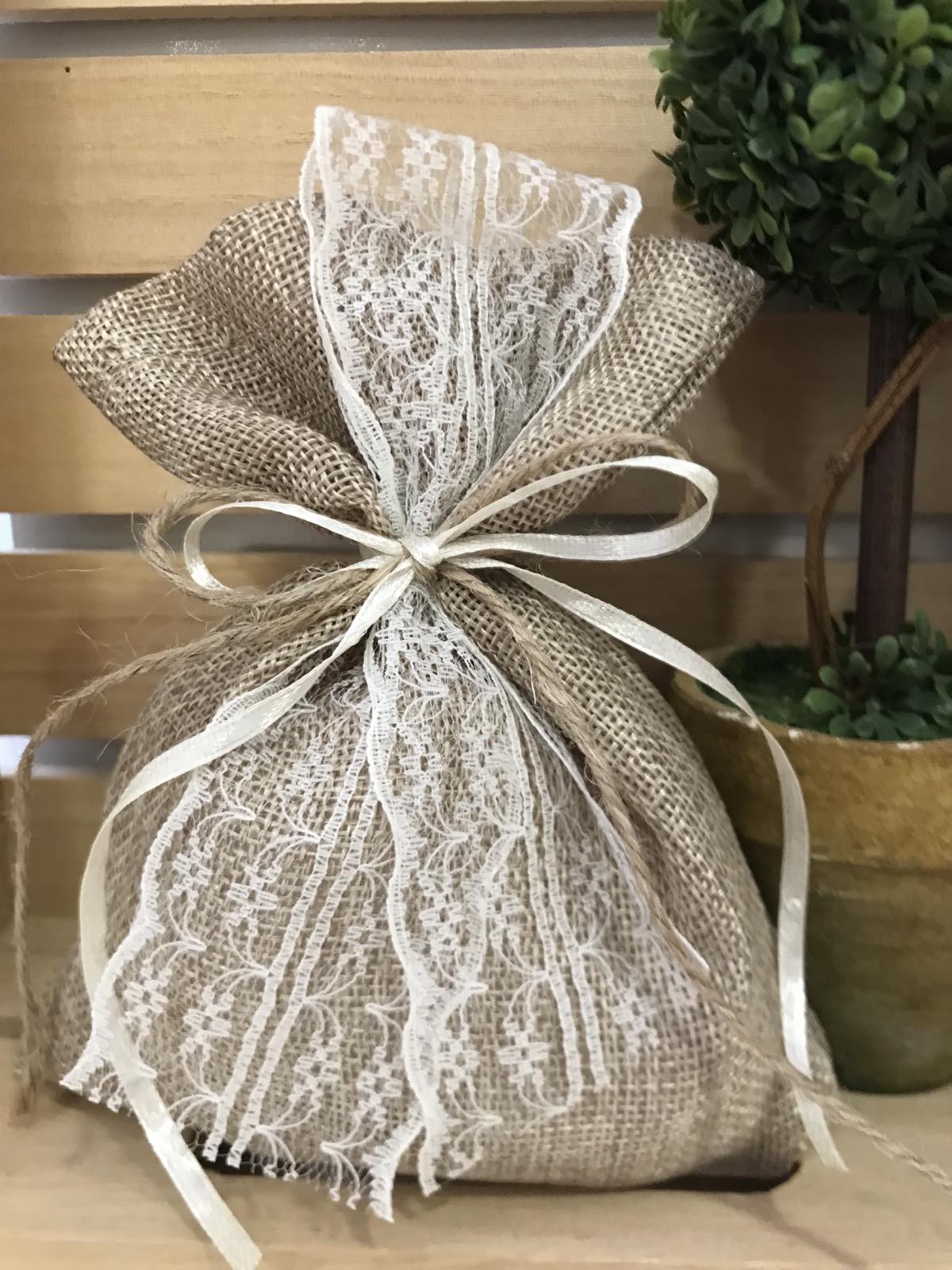Έτοιμη μπομπονιέρα πουγκί καμβάς με δαντέλα στολισμένο και κορδελάκια λινάτσας.