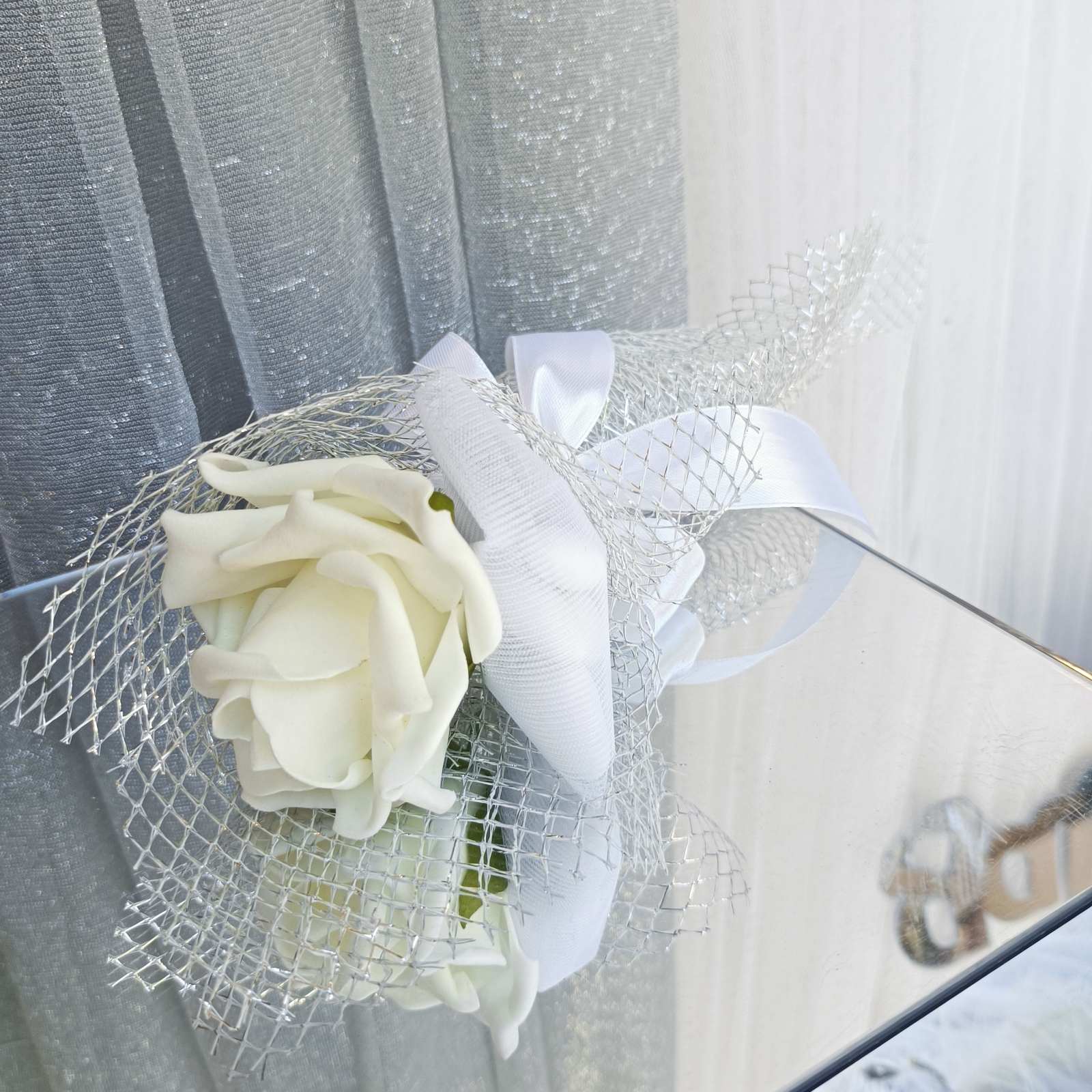 Η μπομπονιέρα περιλαμβάνει: υφασμάτινο τριαντάφυλλο ,ασημί δίχτυ και κορδέλα
