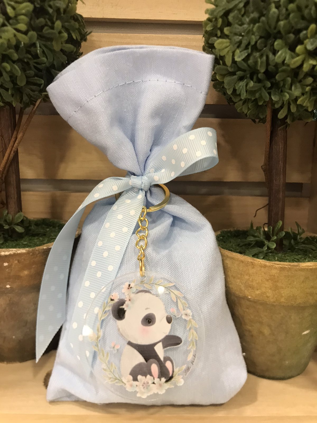 Έτοιμη μπομπονιέρα πουγκί υφασμάτινο με μπρελόκ plexi glass αρκουδάκι panda