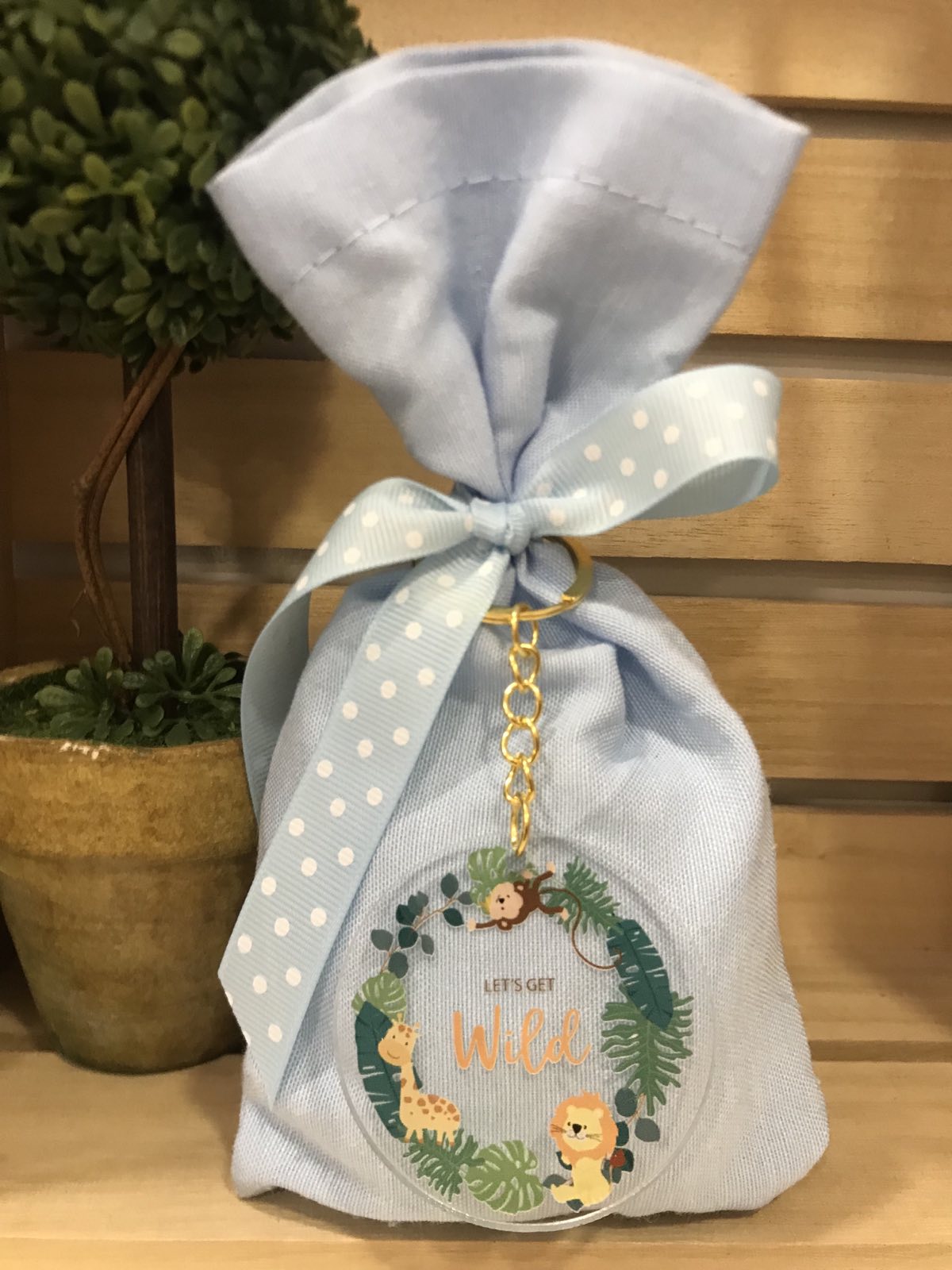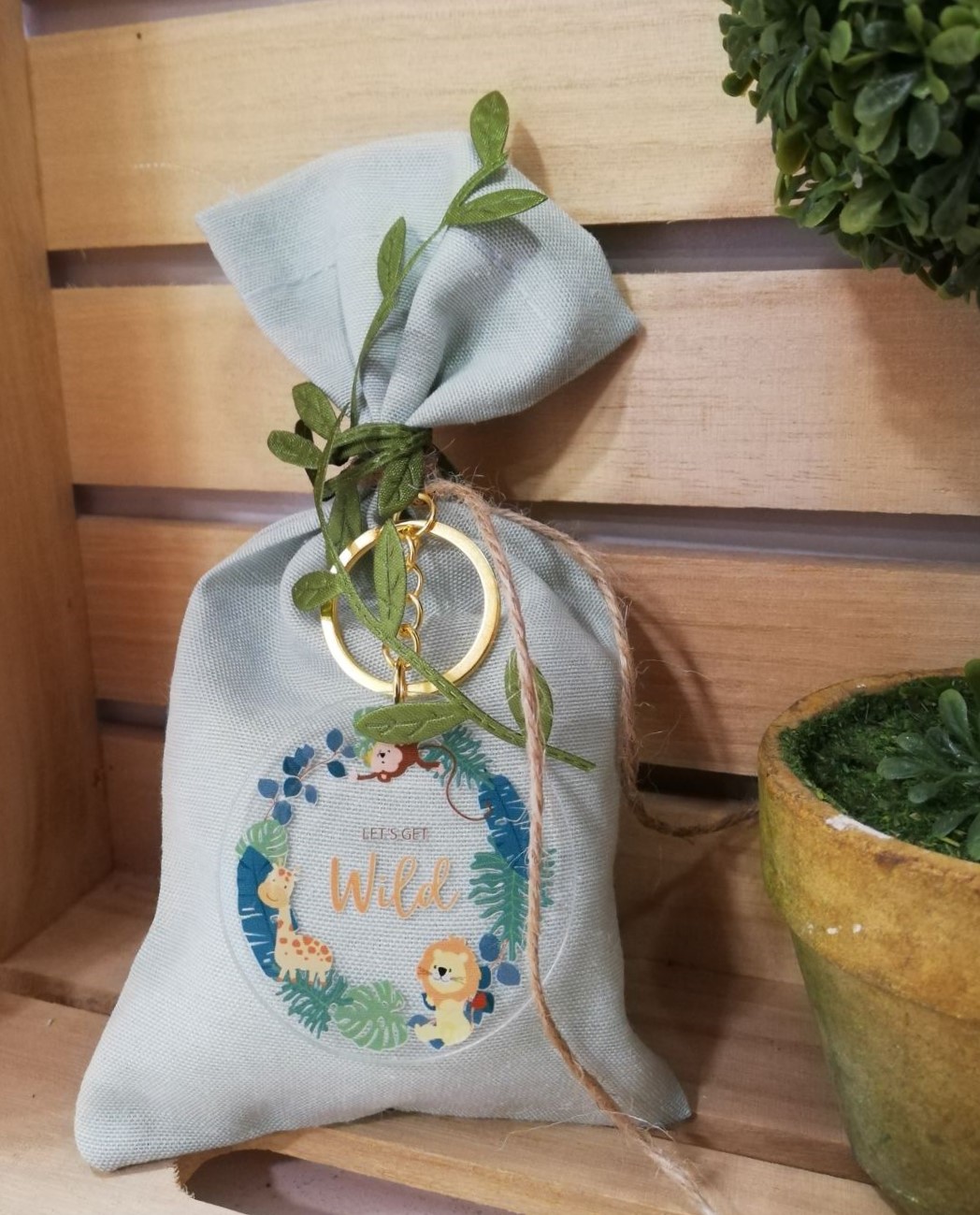 Έτοιμη μπομπονιέρα πουγκί υφασμάτινο με μπρελόκ plexiglass ζωάκια της ζούγκλας