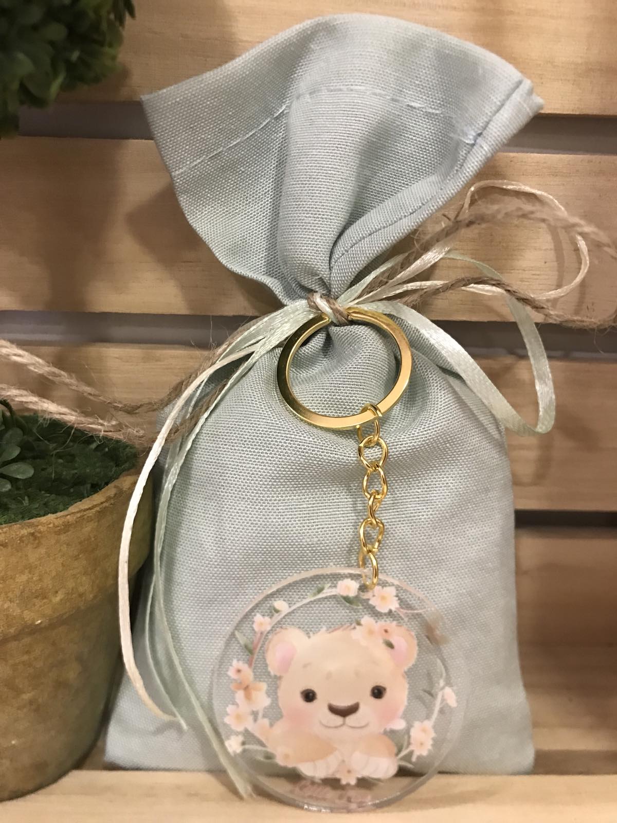Έτοιμη μπομπονιέρα πουγκί υφασμάτινο με μπρελόκ plexiglass τιγράκι