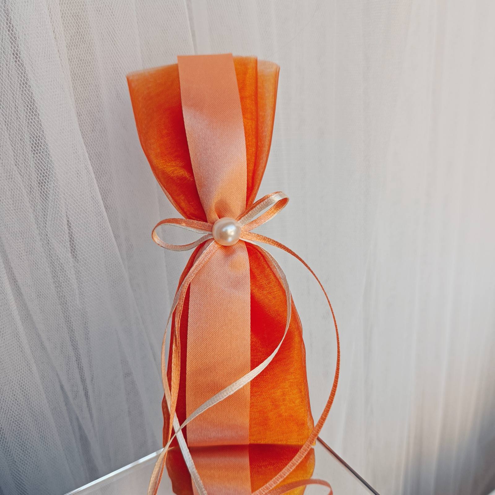 Οι μπομπονιέρες περιλαμβάνουν τούλι πορτοκαλί οργαντίνα, δέσιμο στο φιογκάκι με πέρλα και 5 κουφέτα αμυγδάλου της εταιρείας Χατζηγιαννάκη.Στην κατασκευή της μπομπονιέρας μπορείτε να επιλέξετε χρώματα σε κορδέλες της αρεσκείας σας ώστε να διακοσμηθεί όπως εσείς θέλετε.
