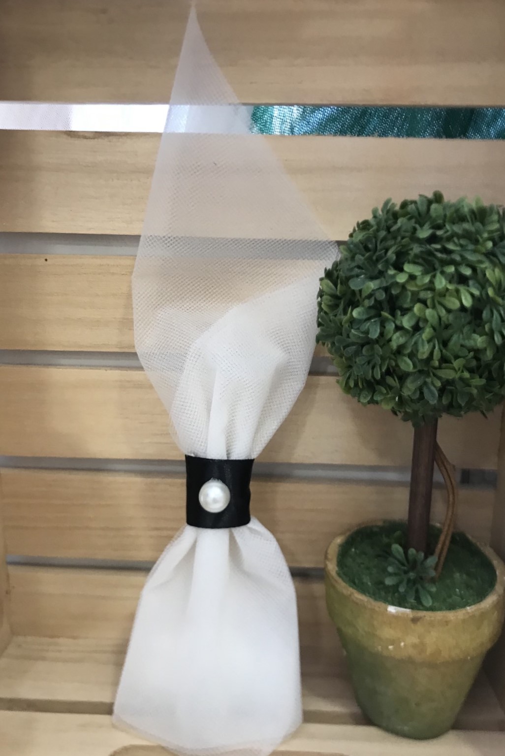 Οικονομικές τούλινες μπομπονιέρες γάμου με τούλι, κορδέλα σατέν και πέρλα.