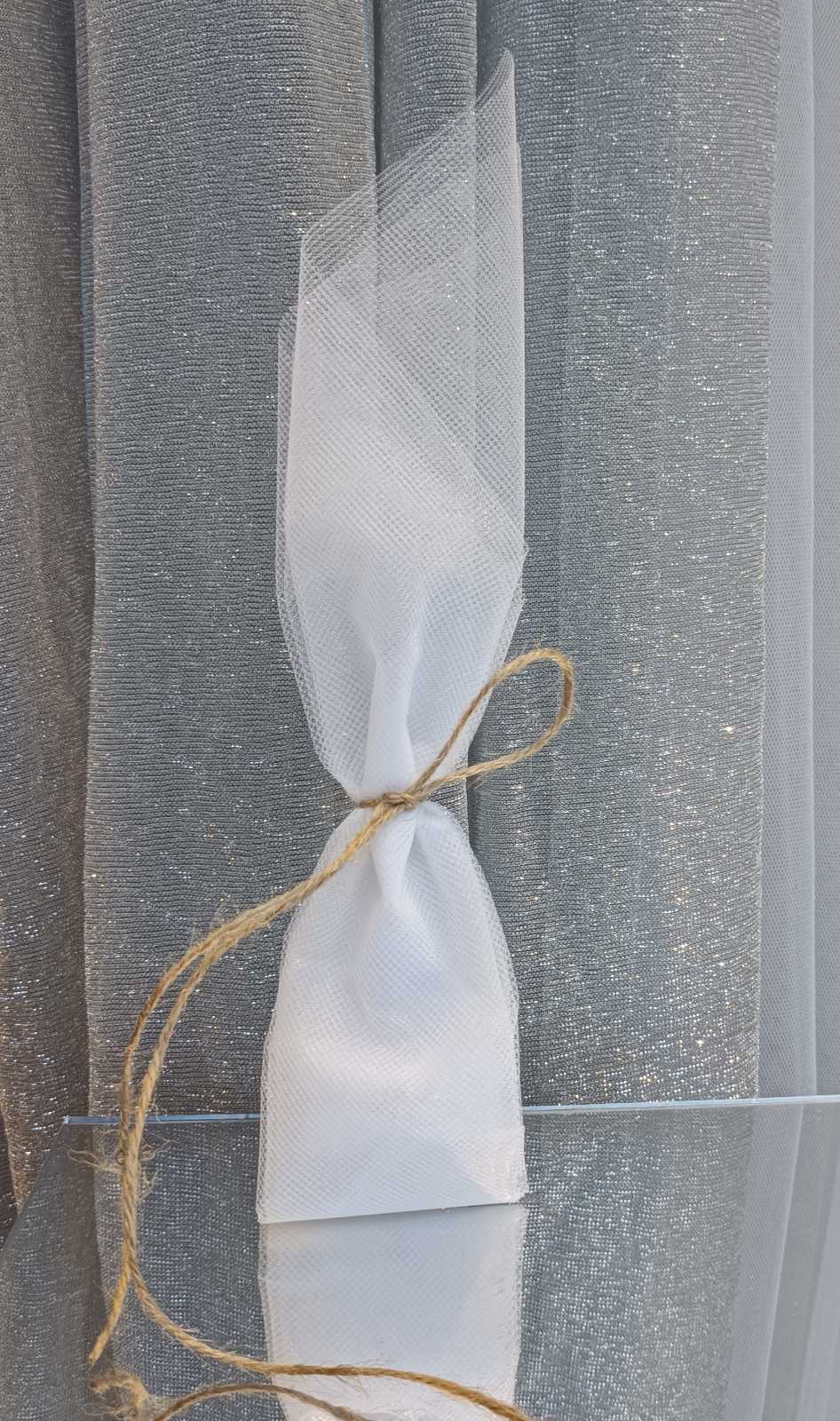 Οικονομικές μπομπονιέρες για γάμο με λευκό τούλι και κορδέλα λινάτσας σε μοντέρνο, minimal δέσιμο.