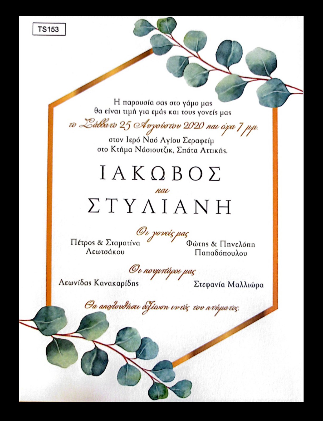 Προσκλητήριο γάμου σε όμορφη minimal σχεδίαση με φύλλα από ευκάλυπτο τυπωμένα σε χαρτί ακουαρέλας. Συνοδεύονται από φάκελο του ίδιου χαρτιού.
