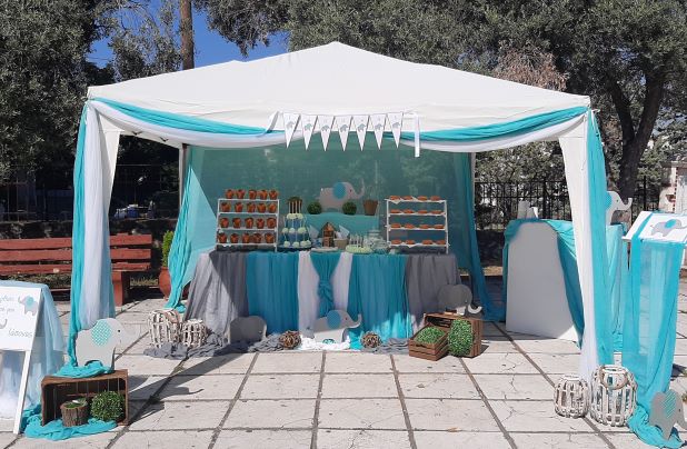 Τραπέζι υποδοχής για μπομπονιέρες και κεράσματα με τέντα ή αψίδα