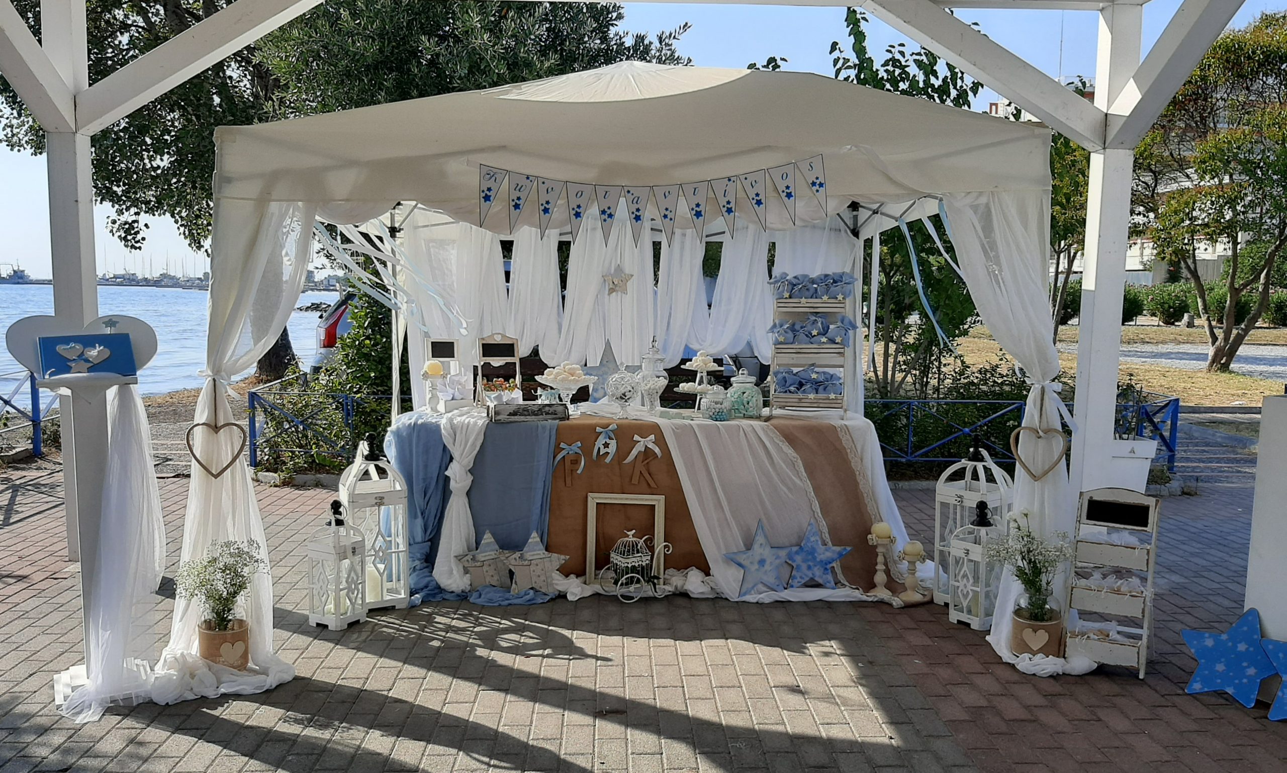 Πρόταση στολισμού για γάμο – βάπτιση με λινάτσα και γαλάζιες αποσχρώσεις, διακοσμητικά απο αστεράκια και καρδούλες