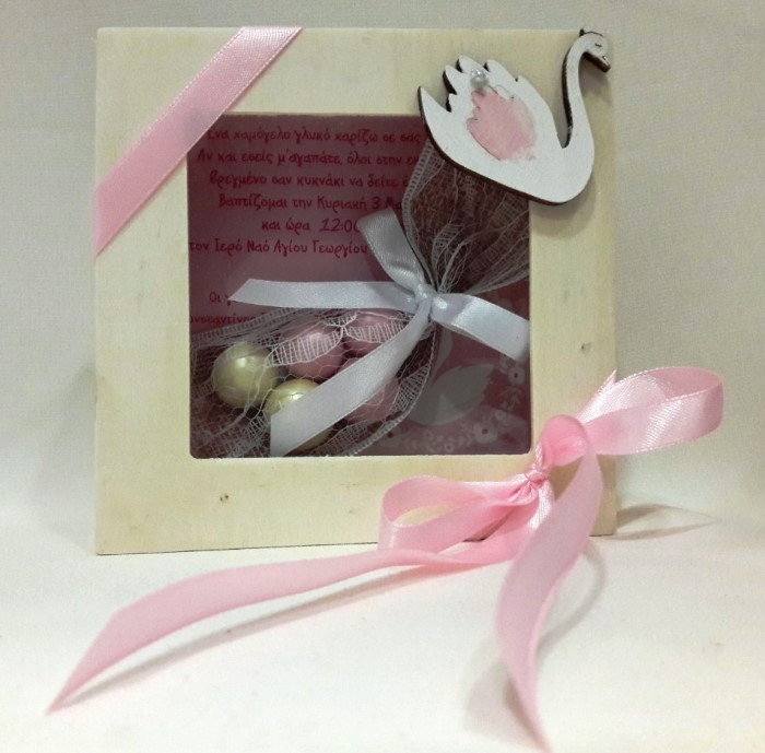 Μπομπονιέρα – Προσκλητήριο Βάπτισης σε ξύλινο κουτάκι με διακοσμητικό κύκνο. Η μπομπονιέρα – προσκλητήριο είναι από ξύλο και σαν διακόσμηση έχει ξύλινο κυκνάκι και ροζ κορδέλα.