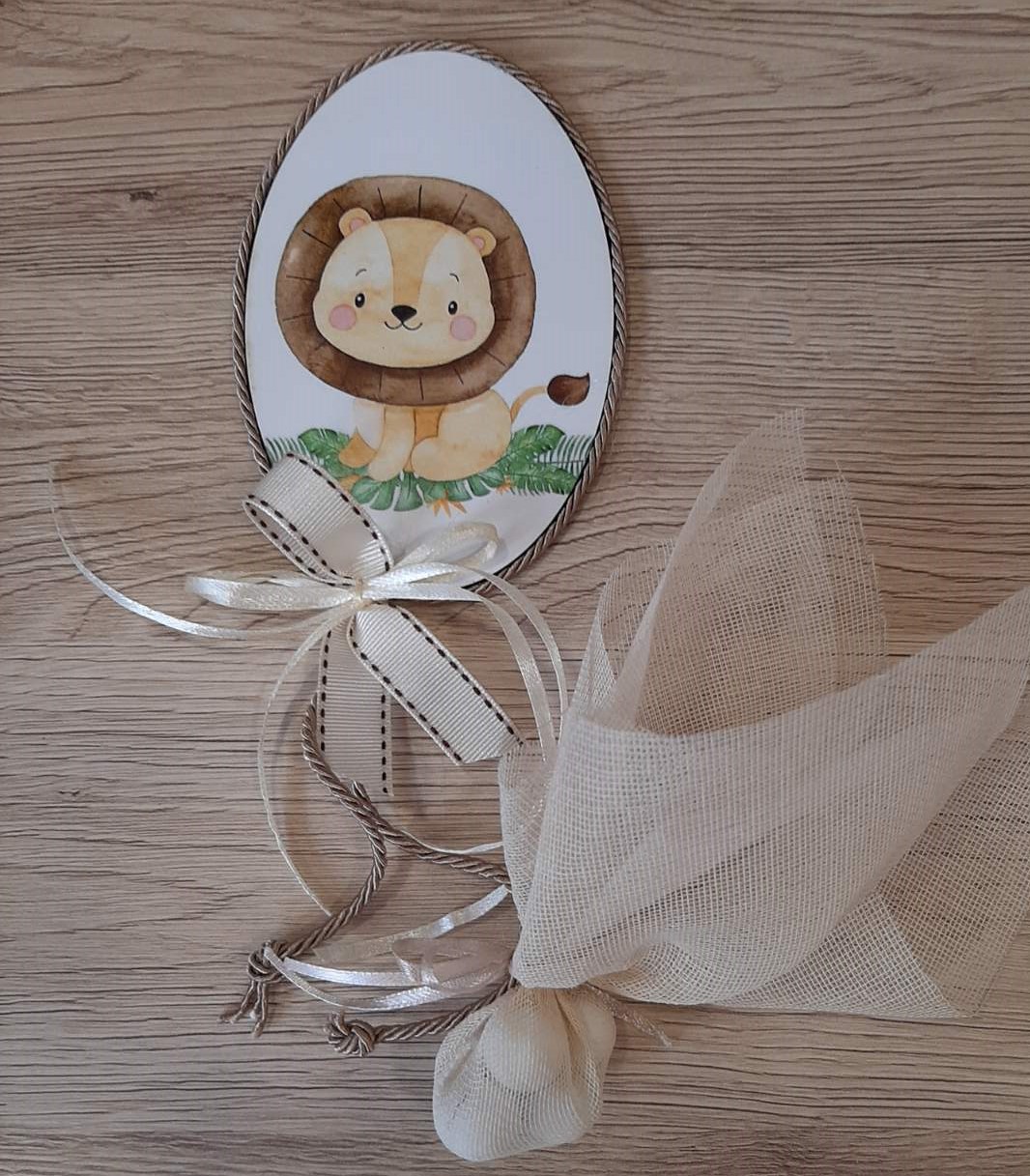 Μπομπονιέρα – Προσκλητήριο Βάπτισης Οβάλ ξύλινο καδράκι με παράσταση λιονταράκι. Μοναδική πρόταση για να φτιάξετε όποιο θέμα θέλετε για προσκλητήρια μπομπονιέρες βάπτισης